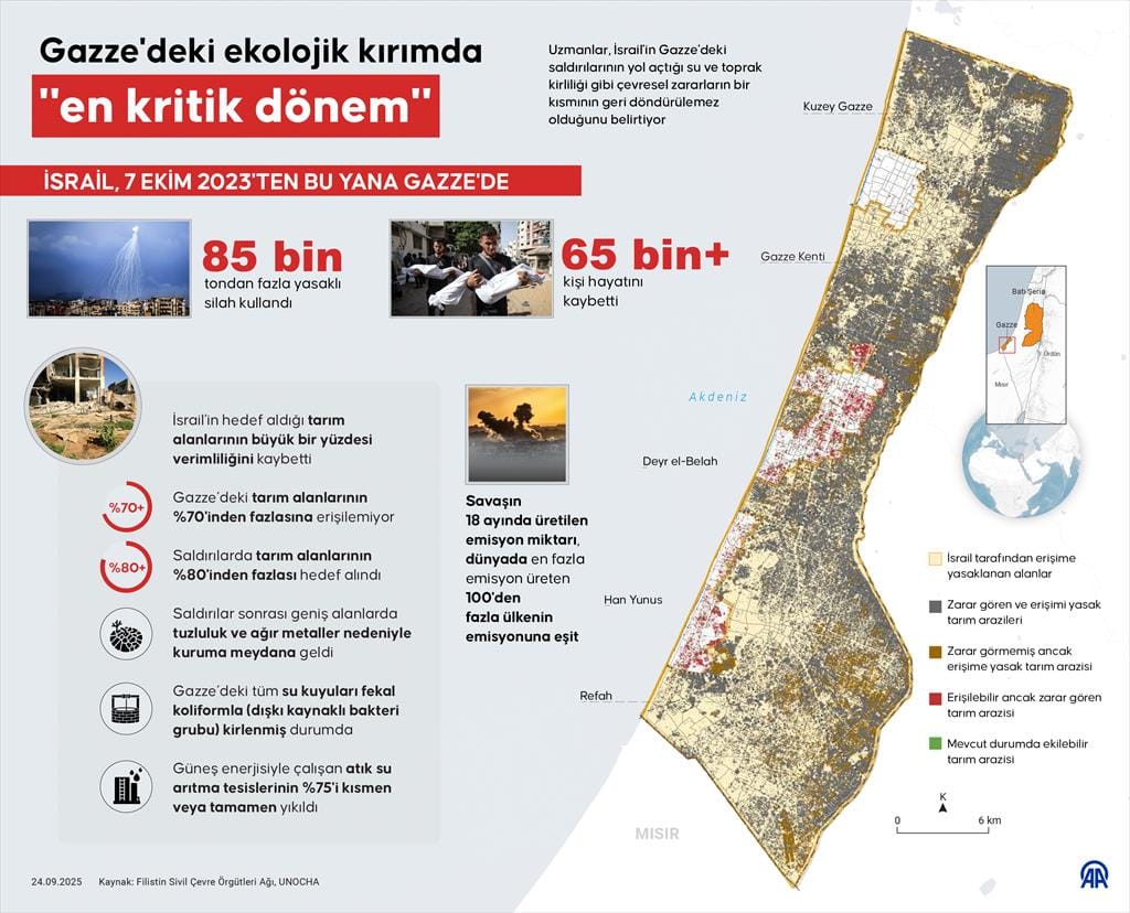 Filistin Sivil Çevre Örgütleri Ağı Koordinatörü Abeer Butmeh, İsrail’in Gazze’deki saldırılarının yol açtığı su ve toprak kirliliği gibi çevresel zararların bir kısmının geri döndürülemez olduğunu belirterek, “Gazze’deki durumla ilgili en kritik dönemde olduğumuzu düşünüyorum.” dedi.