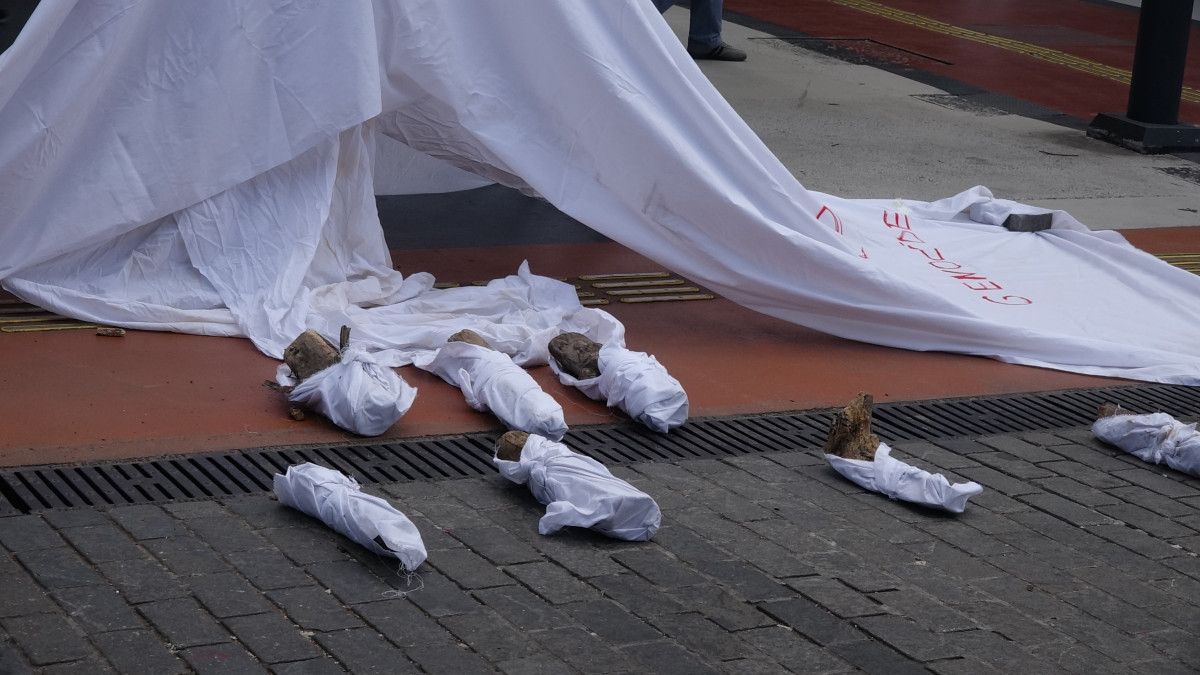 Bir çadır kurarak temsili kefene sardığı odun parçalarını yere dizen Sağlam, “Odunlar uyanın; Gazze’de bebekler ölüyor, insanlık ölüyor” diyerek slogan attı.